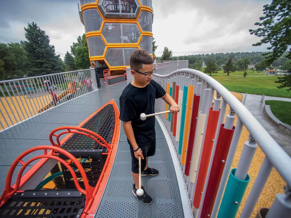 Paco Sanchez Park’s $13 million renovation has delivered on the Re-Imagine Play concept Denver Parks and Recreation announced back in 2017. The main playground structure, completed in September 2020, is a vertical jungle gym of sorts modeled after a 1950s microphone—an homage to the park’s namesake, who started the city’s first Spanish-language radio station. A peek inside inspires wonder in kids, who are faced with a mazelike space with nearly 50 different ways to climb to the top of the 30-foot-tall complex.