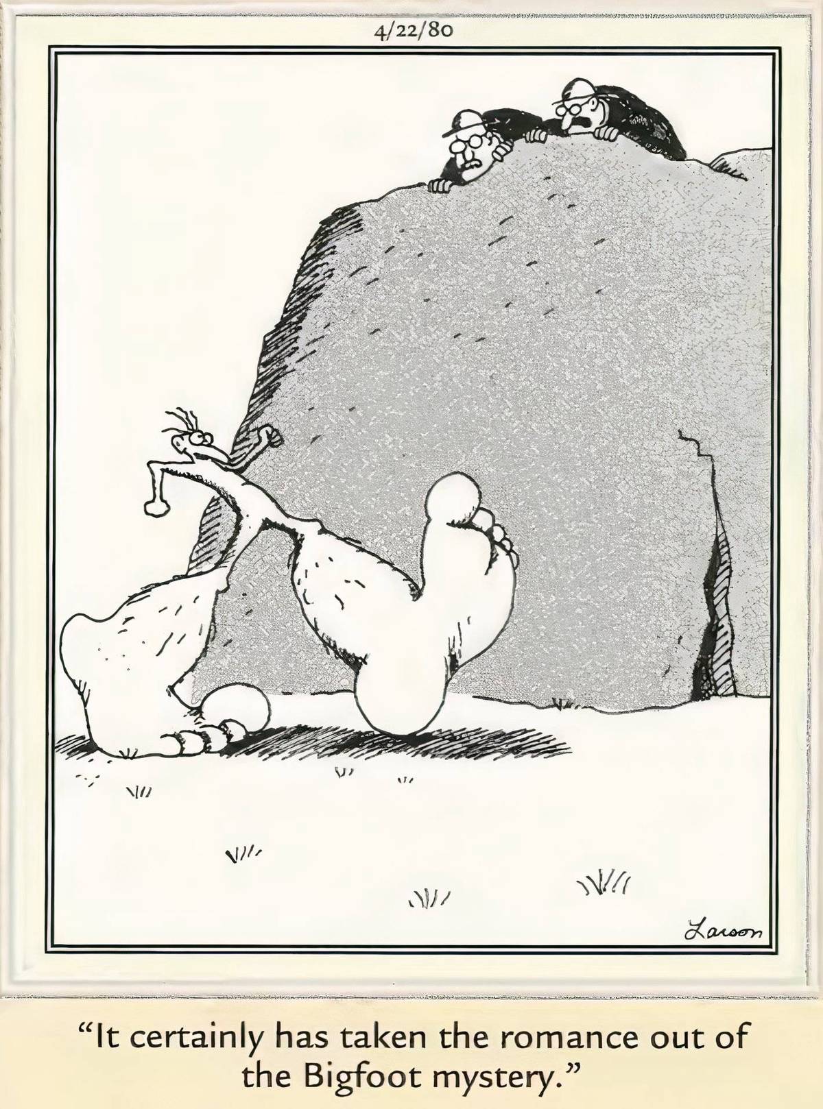Two cryptid hunters happen to come across a most elusive sight: the one and only Bigfoot! However, Bigfoot does not look at all how many thought he would look, including the two humans who see him in The Far Side. With two gigantic human feet on an otherwise normal-sized body, Bigfoot has that name for a very obvious reason, given what he actually looks like. Seeing this sasquatch, the two humans are left feeling deflated, thinking that seeing that Bigfoot is just actually made of two massive human feet takes the romance out of the mystery.