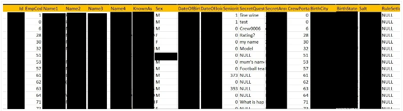 The first file holds the information on named passengers and the second file has employee information with numerous fields that included name, date of birth, country of birth, location, date employment started, their “secret question,” “answer,” and salt.