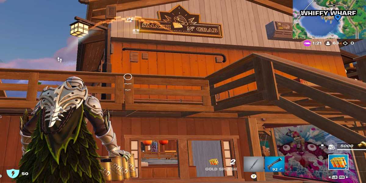The Jewelry Case in Whiffy Wharf is located near the beach on the northwest edge of the map. You can access it from the boardwalk itself or from a platform below that leads directly up to the Smash N' Grab store. This is one of the smallest jewelry store locations on the current map, so scope it out beforehand so you don't get ambushed by another player or NPC.
