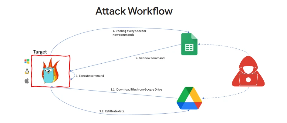 Here, the tool uses the Google Sheets commands after installation on the victim machine to extract data into Google Drive, which is done to hide malicious activity.