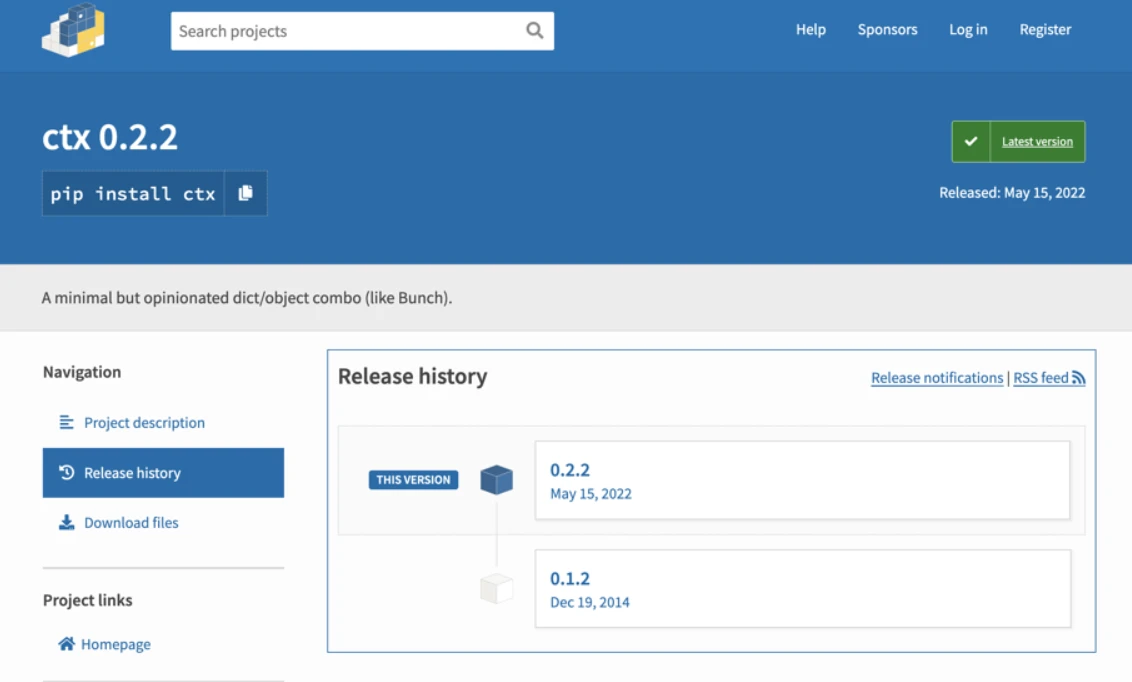 On the PyPI registry for the Ctx package, the latest version of 0.1.2 showed a date of publication of December 19, 2014, until this week, as you see in the below image:-