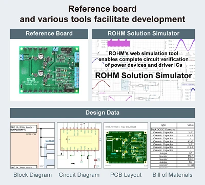 Using ROHM’s reference designs together with ROHM Solution Simulator minimizes application development man-hours at each design stage (i.e. circuit/board/noise/thermal design, simulation).