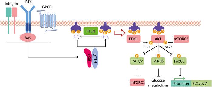 The review meticulously outlines how the activation of the PI3K signaling pathway leads to multiple downstream effects that promote tumor survival and growth. Upon the activation of growth factor receptors, including receptor tyrosine kinases (RTKs), G-protein coupled receptors (GPCRs), and integrins, p110α is released from its inhibition by p85 and initiates the conversion of PIP2 to PIP3. This cascade plays a critical role in recruiting protein kinase B (AKT) to the plasma membrane, where it undergoes phosphorylation by phosphoinositide-dependent kinase 1 (PDK1) and mTORC2. The activation of AKT serves as a central node for further phosphorylation activities that promote cellular functions such as glucose metabolism, protein translation, and the regulation of the cell cycle.