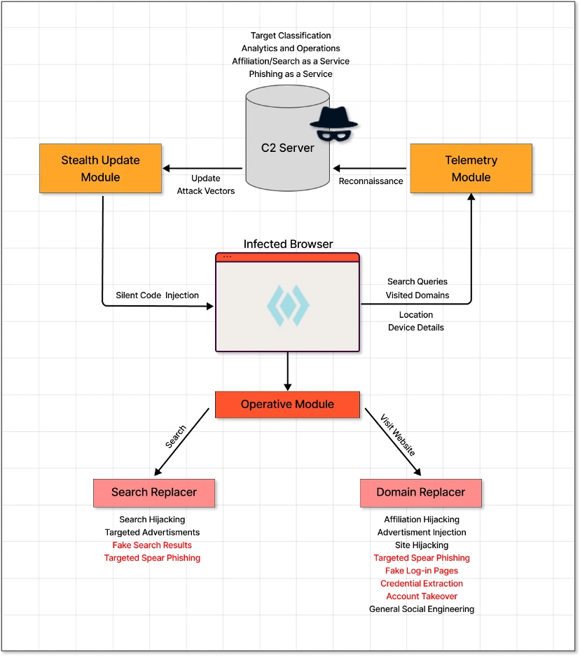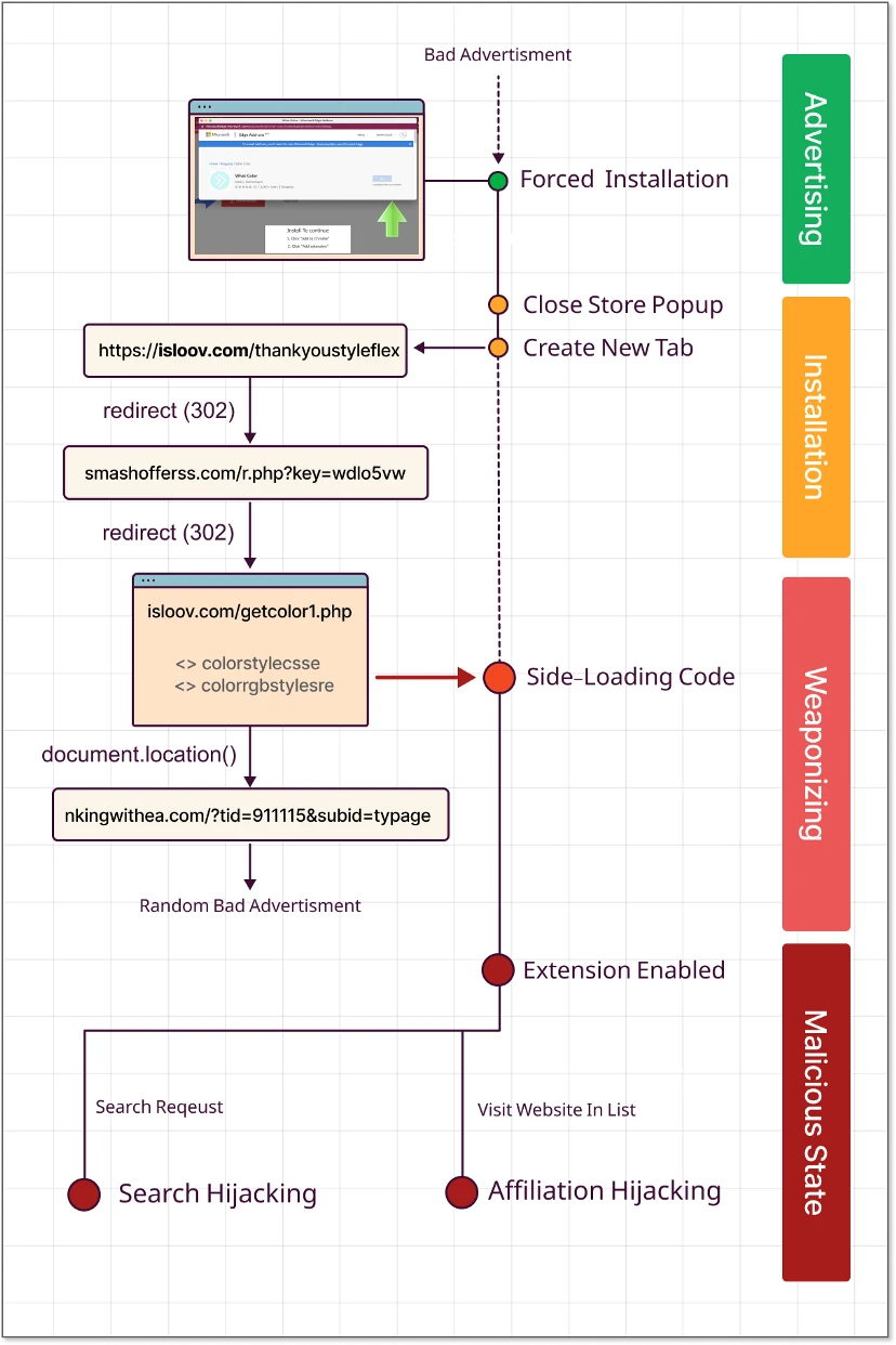 The primary objective of these malicious scripts is to make the extension perform search hijacking and insert affiliate links.