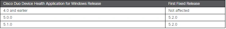 The Cisco Duo Device Health Application for Windows is impacted. Cisco also confirms that this vulnerability does not impact Cisco Duo Device Health Application for macOS.