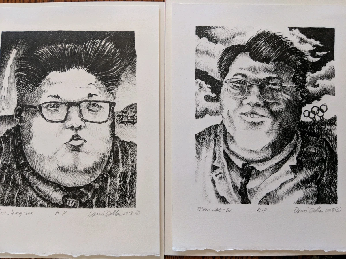 His shock makes sense given how pointed some of the art is. “Some of it is critical of what’s going on in North Korea,” he says. “Some of it is more metaphorical. But some is more explicit.” Each of the 47 Artnauts who worked on this project produced two pieces that will be displayed side-by-side at the museum. Some of those juxtaposed pieces are politically charged. For instance, Dennis Dalton, one of the founding members of the Artnauts, produced two lithograph prints: One of a smiling South Korean President Moon Jae-in with Olympic rings in the background; the other features a stoic-looking North Korea Supreme Leader Kim Jong-un with a nuclear missile launching behind him (photos below).