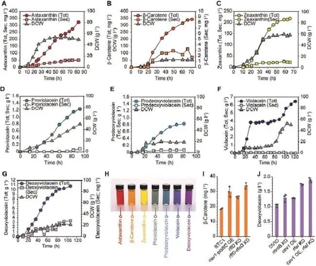 This research reports for the first time the production of rainbow colorants comprising three carotenoids and four violacein derivatives from glucose or glycerol via systems metabolic engineering and membrane engineering. The research group focused on the production of hydrophobic natural colorants useful for lipophilic food and dyeing garments. First, using systems metabolic engineering, which is an integrated technology to engineer the metabolism of a microorganism, three carotenoids comprising astaxanthin (red), -carotene (orange), and zeaxanthin (yellow), and four violacein derivatives comprising proviolacein (green), prodeoxyviolacein (blue), violacein (navy), and deoxyviolacein (purple) could be produced. Thus, the production of natural colorants covering the complete rainbow spectrum was achieved.