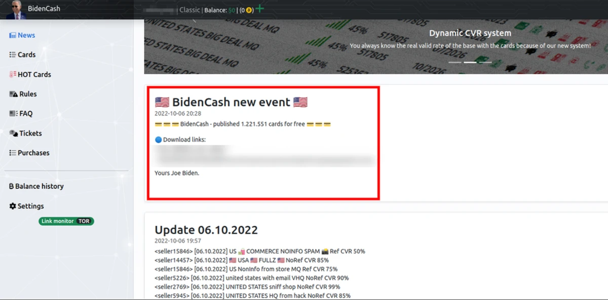 The BidenCash marketplace was launched in June 2022 as a means for the theft of bank cards. As a promotional move, the company leaked a few thousand cards.