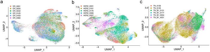 The application of Uniform Manifold Approximation and Projection (UMAP) visualization further enhances interpretability by projecting high-dimensional single-cell data into comprehensible two-dimensional maps. In these UMAP plots, cancer subtypes—ER+, HER2+, and TN—cluster distinctly yet exhibit varying degrees of overlap, visually reinforcing insights gleaned from quantitative analyses. Color-coded representations indicate sample-specific cellular distributions, allowing for a nuanced appreciation of tumor heterogeneity in spatial contexts.