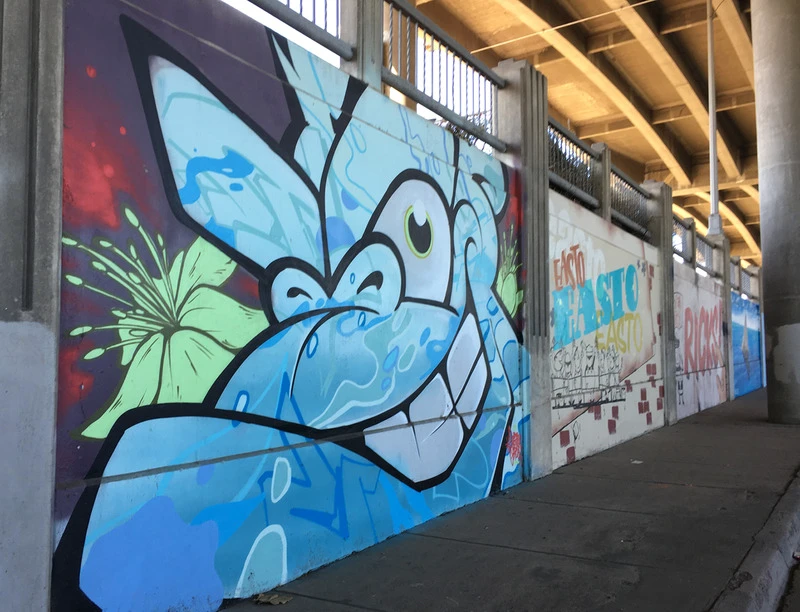 What’s remarkable about the art in this viaduct is that it’s successful, if only for brief moments between bursts of noisy traffic, in directing attention away from the sidewalk, the road, or the nearby Purina dog food factory. Although most drivers still speed through the area, a few slow down (in the middle of the road) to steal a few more seconds as their passengers press up against windows and take in the art.