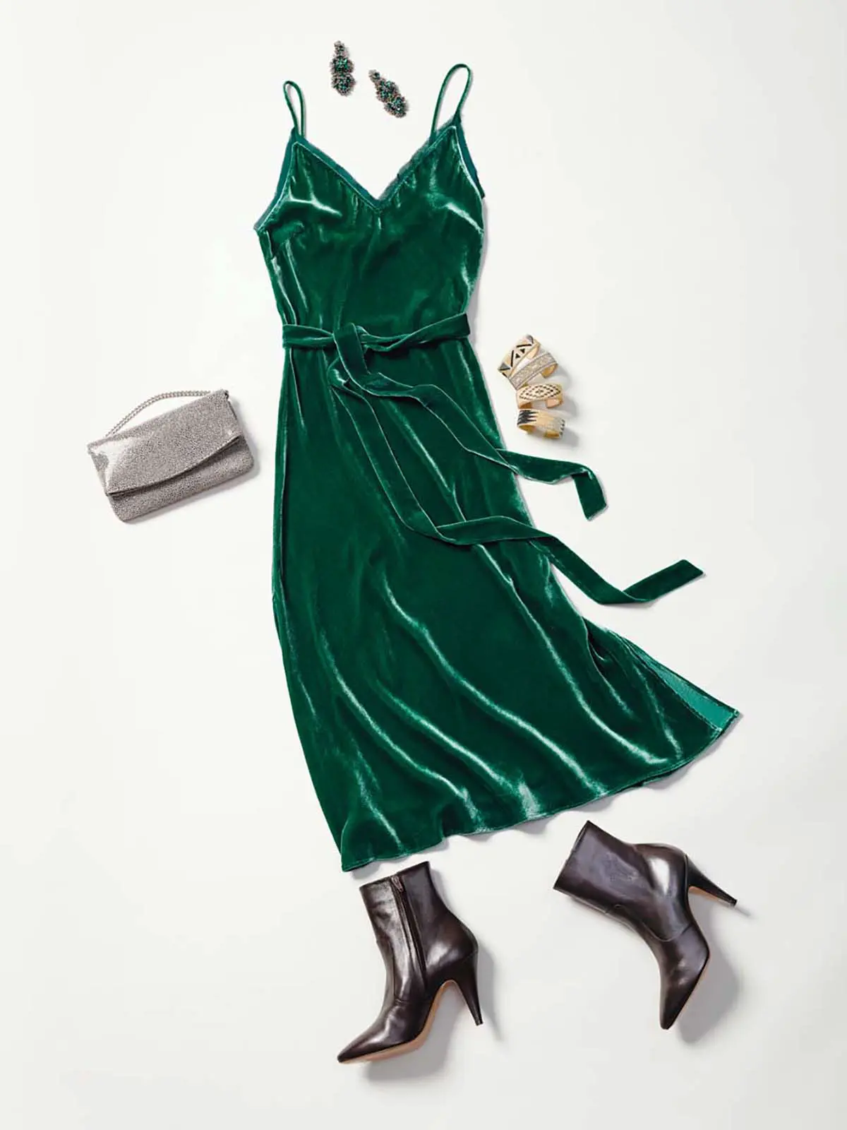 You can easily tone this elegant emerald number down by adding a simple tulle turtleneck underneath. Frame viscose and silk velvet slip dress, $425, Bazar, 303-593-0494