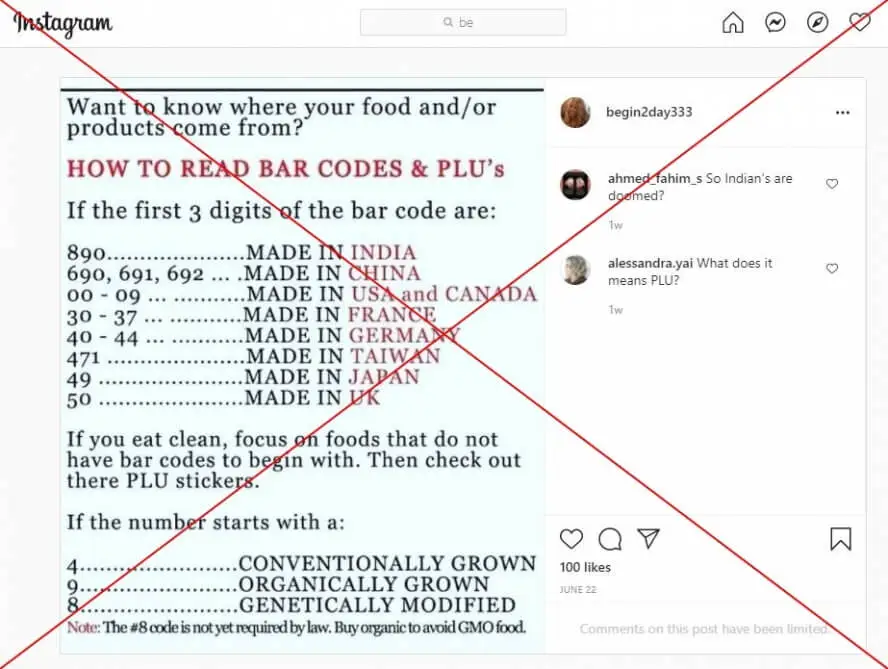 Identical posts, claiming to explain how to read the barcodes and PLU stickers found on products and produce, were shared and liked hundreds of times on Facebook and Instagram in June 2021.