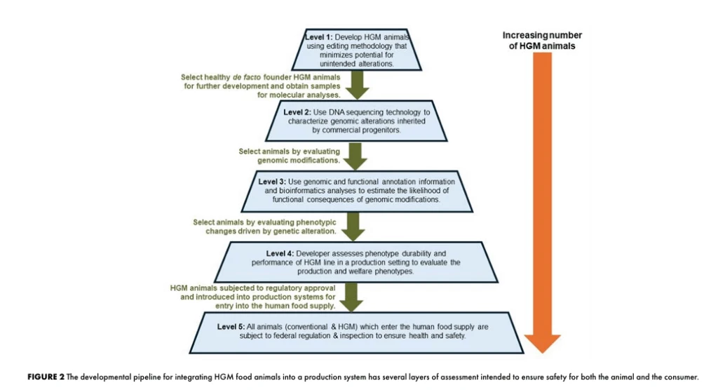 In the United States, animals developed with HGMs [heritable genetic modifications] must be approved by the Food and Drug Administration (FDA). This ensures both the health and welfare of animals carrying traits created with HGM and the safety of food animal products for consumers.