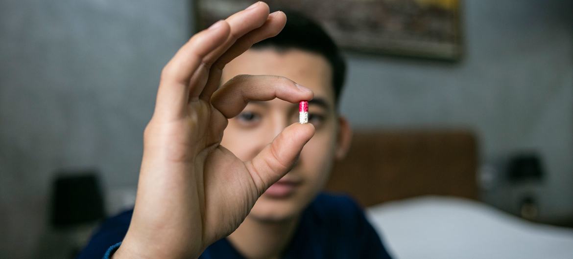 A man in Uzbekistan shows the medicine he takes to combat HIV.