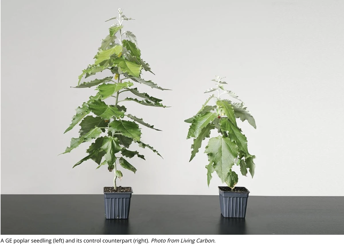 In 2022, Living Carbon reported the promise of genetically engineered poplar trees in combating climate change by improving their ability to capture and store carbon. By incorporating a photosynthesis-enhancing trait into poplars, they reported a significant increase in growth speed and a 53% boost in above-ground biomass production. This breakthrough was achieved through a photorespiration bypass pathway that allows the trees’ chloroplasts to more efficiently convert waste products into glucose and cellulose, thereby devoting more energy toward growth and increasing carbon assimilation. The GE trees also produce decay-resistant wood, which further improves carbon storage. The results of the study demonstrate the value of biotechnology in enhancing terrestrial carbon capture and storage, exceeding the capacity of conventional trees and contributing to climate change mitigation.