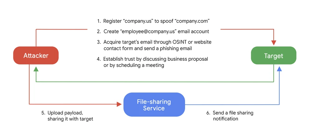 Filling out the victim’s email ID for viewing the link. This method initiates a link that contains a payload to be delivered to the victim via the file-sharing service provider itself. This makes the detection technique very complicated. Further detailed analysis of the group’s activities was published by Google.