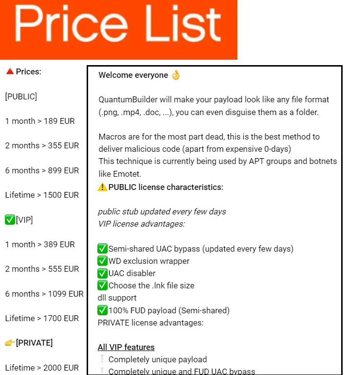 Quantum Builder is available on the dark web for a monthly subscription fee of €189, and here below you can see the full price list:-