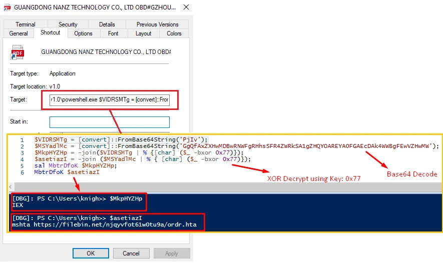 A shortcut is included in this attachment, and this shortcut is used for executing PowerShell code that uses the MSHTA to launch a remote HTA.