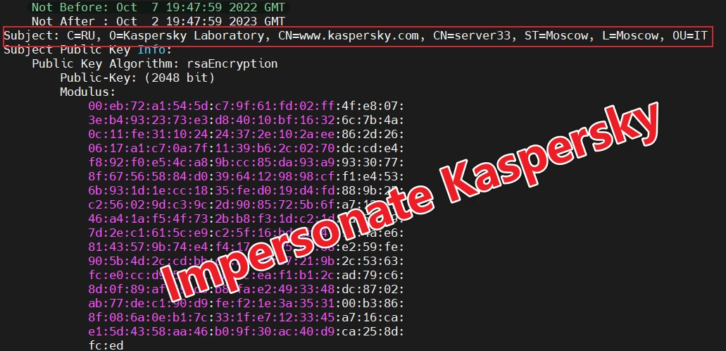 An N-day security vulnerability in F5 appliances is believed to be the source of xdr33. SSL with forged Kaspersky certificates is used to communicate with the command-and-control server.
