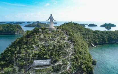 MUST-SEE. Aerial view of the Pilgrimage Island at Hundred Islands National Park in Alaminos City, Pangasinan. It features Stations of the Cross with life-sized statues and a 263-step staircase leading to the 55-foot Christ the Savior statue. (Photo courtesy of DOT Region 1 Facebook)