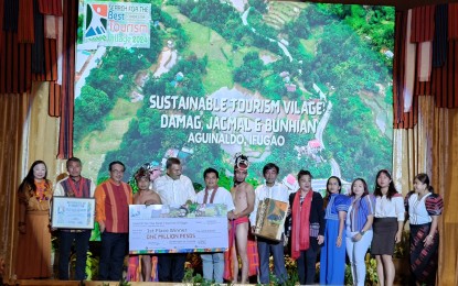 CREAM OF THE CROP. Department of Tourism-Cordillera officials hand the replica of the PHP1 million check to the representatives of the Sustainable Tourism Village of Damag, Jacmal and Bunhian of Aguinaldo town, Ifugao province on Sept. 20, 2024 at the Baguio Country Club. Now on its third year, the award is evolving to be a sought-after award for tourism villages as it encourages communities to improve their destinations. (PNA photo by Liza T. Agoot)
