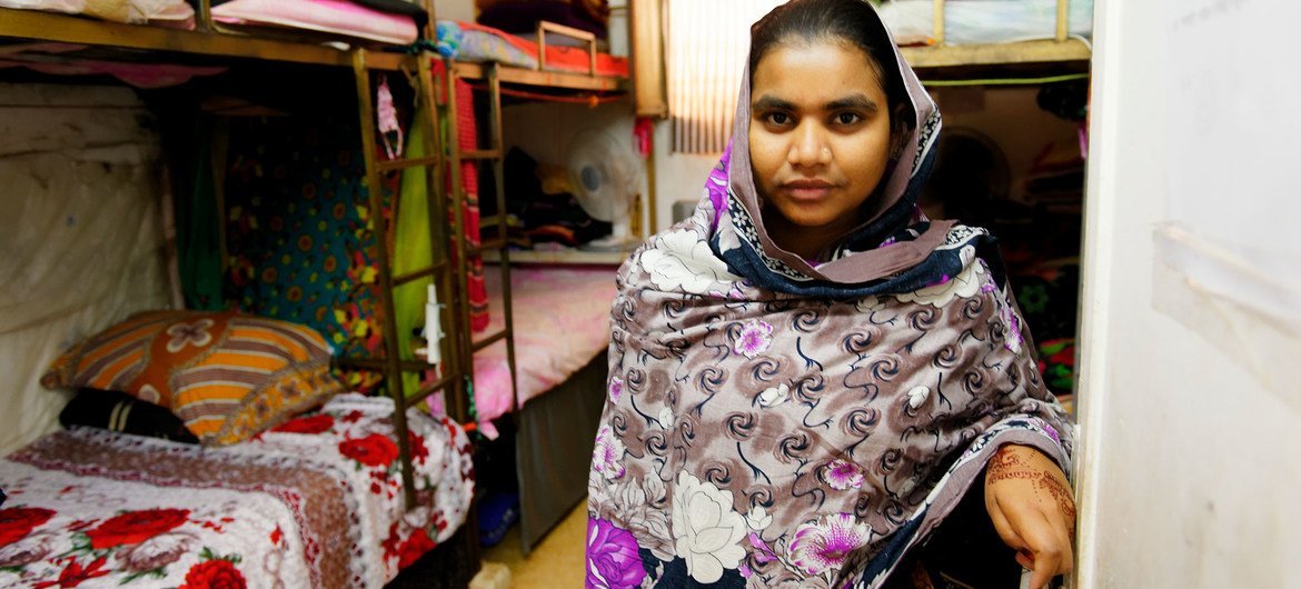 A Bangladeshi garment worker is seen standing in the room she shares with other seven colleagues in a factory dormitory in Jordan.