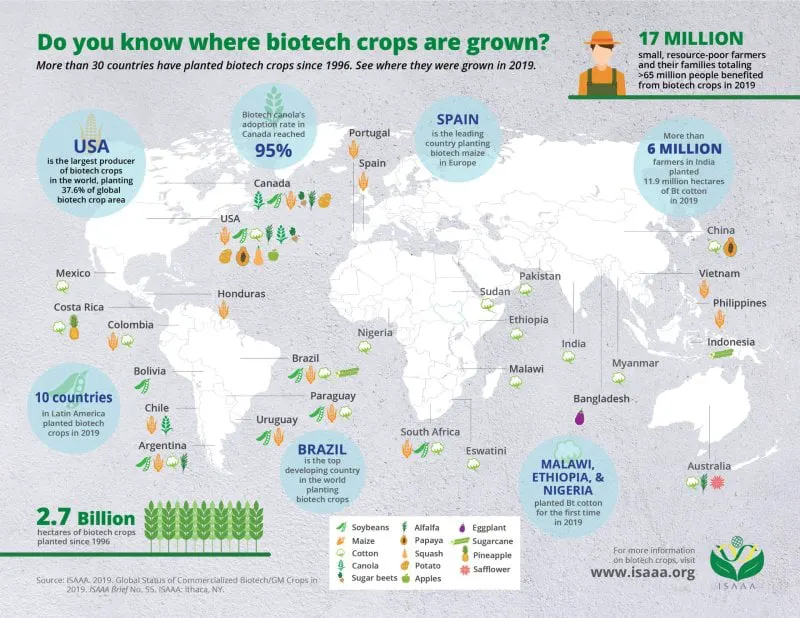 Do you know where biotech crops are grown in the world? This updated ISAAA infographics show where biotech crops were grown in different countries and regions in the world. In 2019, 29 countries from all over the world planted 14 biotech crops, led by the top five countries USA, Brazil, Argentina, Canada, and India.
