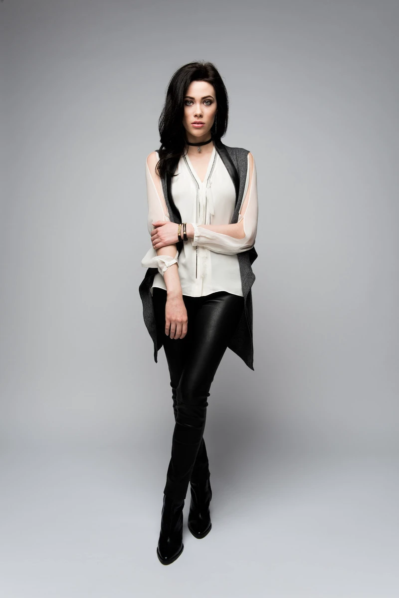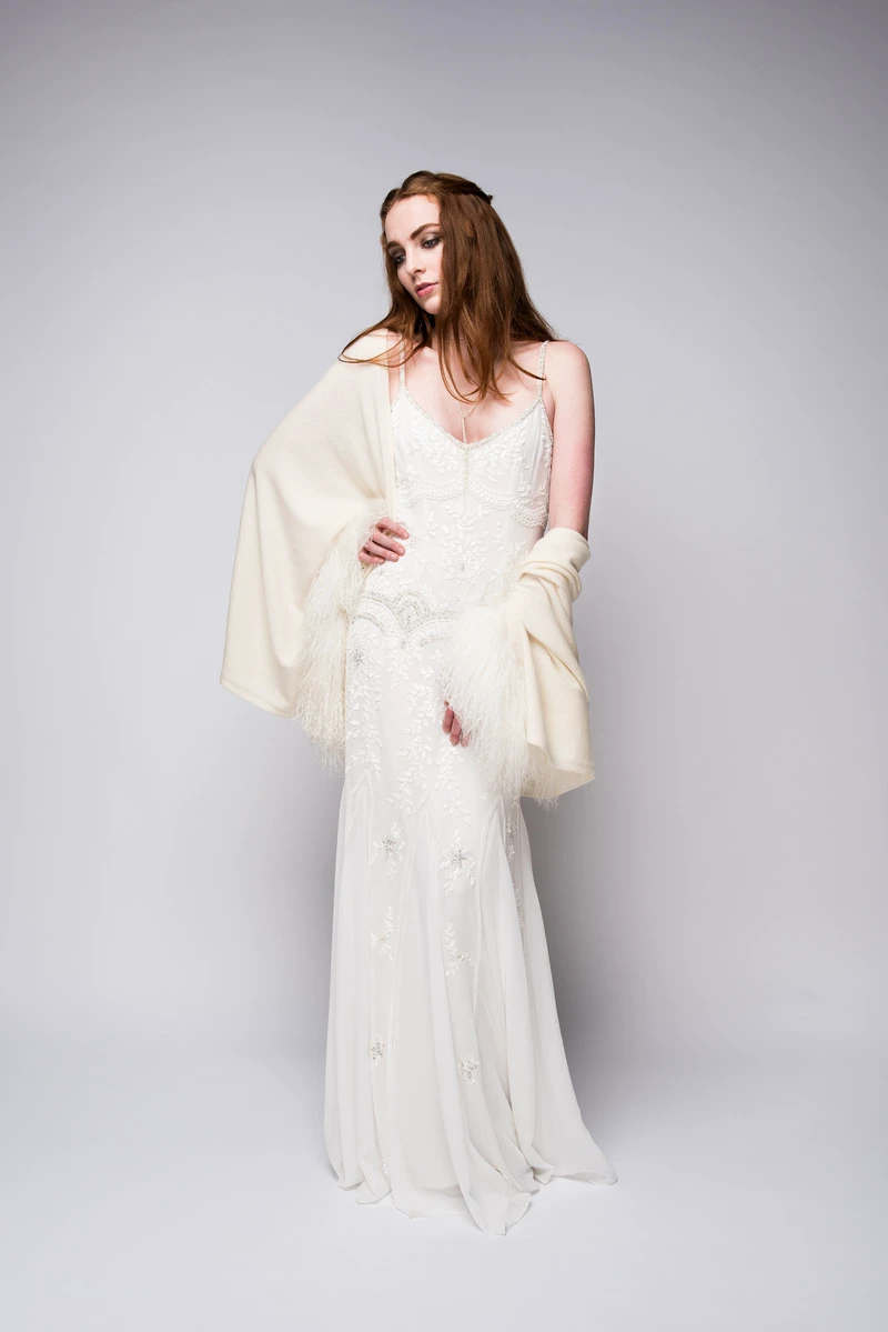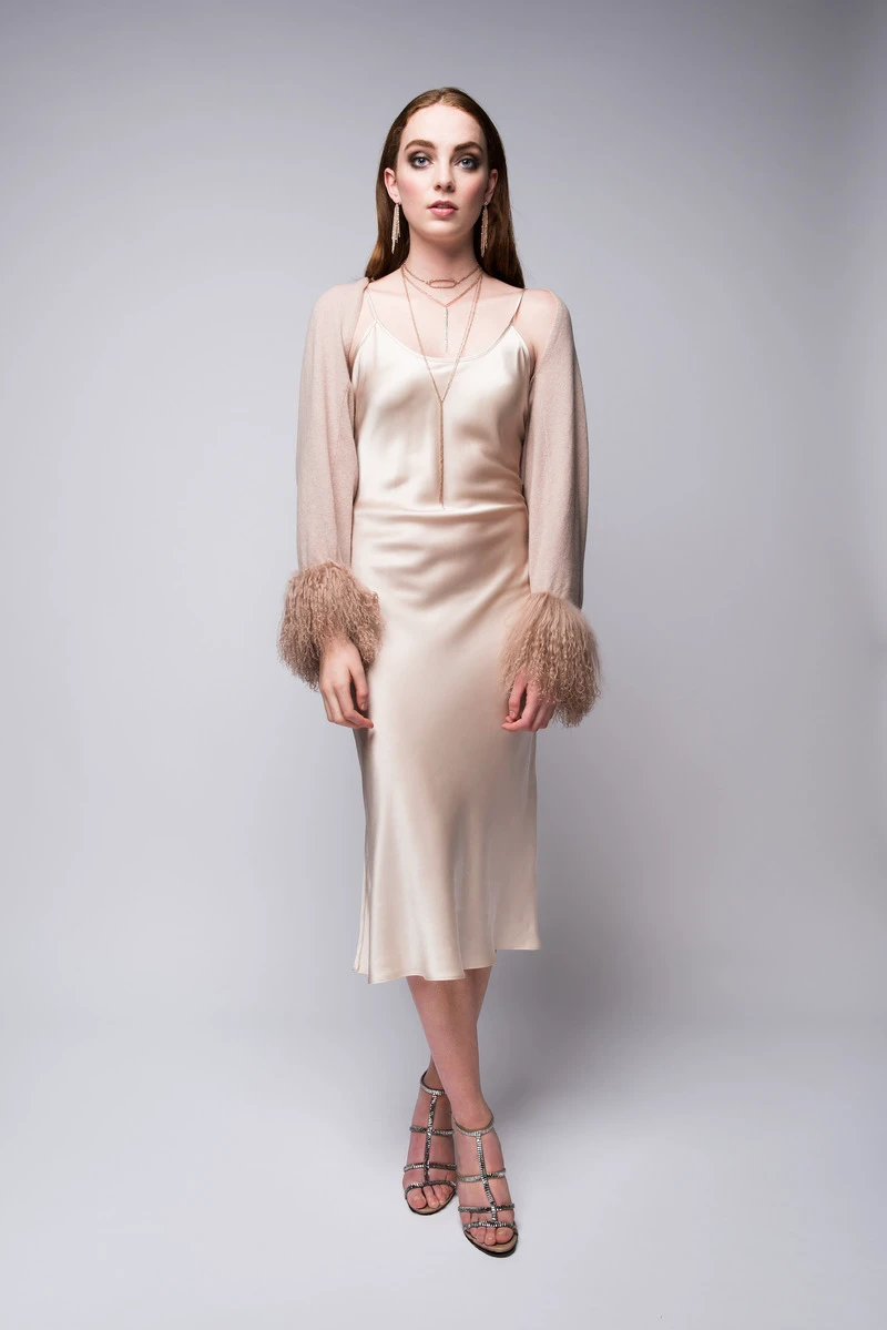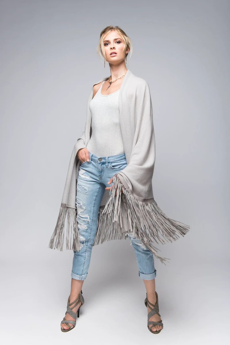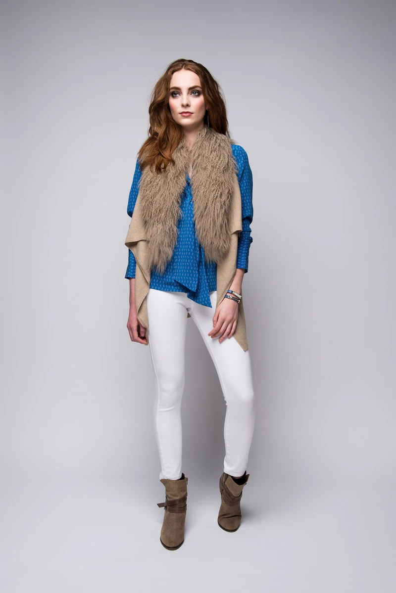 Emma and Grace Bridal Studio bought the wraps and the shrugs in blush, dove grey, and vanilla. The Mongolian Lamb would look amazing on a bride—it’s a little bohemian, unstructured, and very feminine. If a bride is in her wedding dress with cowboy boots on, I can totally see her wearing the suede fringe.