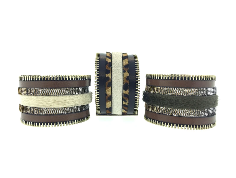 The jewelry line incorporates gold and sterling silver with Tahitian pearls, diamonds, and semi-precious gemstones—labradorite and moonstone are my favorites—as well as nontraditional materials set with diamonds, like leather and horsehair. I also enjoy pairing materials with different textures and finishes to create an interesting design. For example, my Namibia cuff bracelets are created with cowhide, iridescent leather, and zip leather.