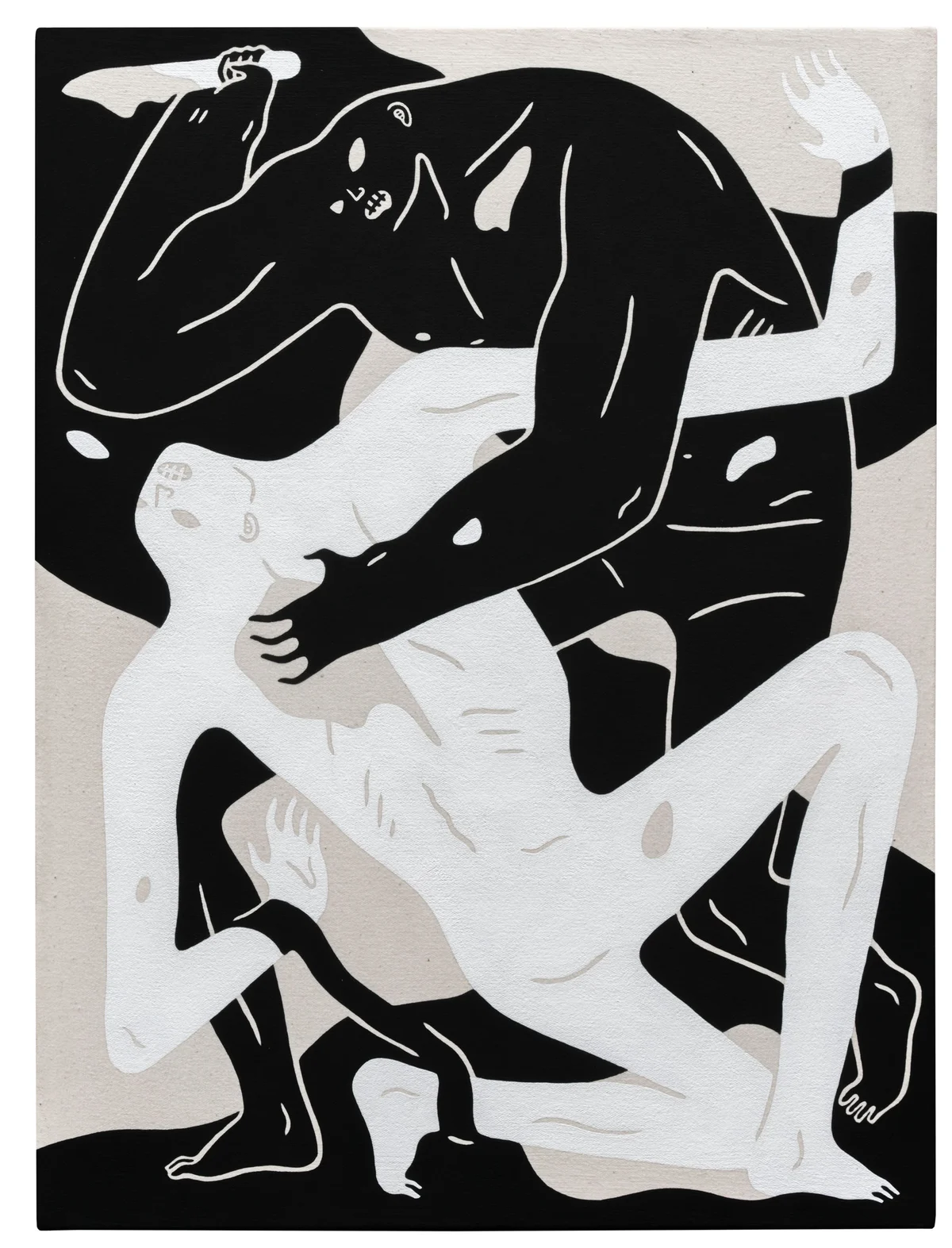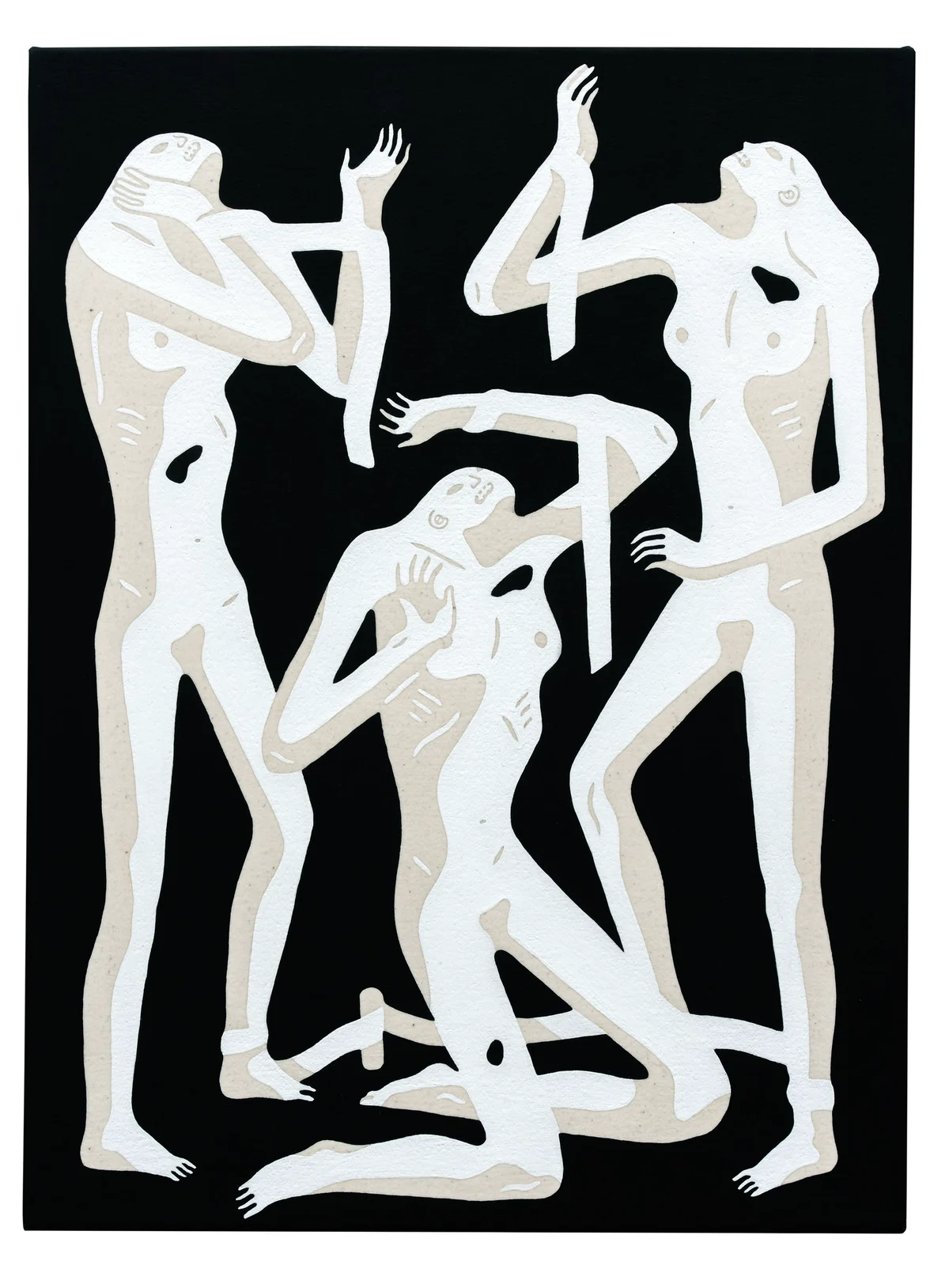 The rest of Peterson’s exhibit—Shadow of Men—will engulf the museum’s second floor. His paintings balance black, white, and pale neutral hues with sparing elegance of an almost decorative quality. Figures brutalizing one another seem to flow into each other like the shapes of a tessellation, enabling viewers to consider their darkness without feeling shocked or alarmed.