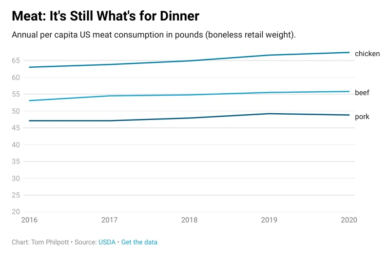 The US Department of Agriculture just released 2020 numbers on meat consumption. For chicken, pork, and even beef—so far, the main target of Silicon Valley disruption—the per capita numbers have crept up since 2016, the year the Manhattan restaurant Momofuku Nishi served the first Impossible Burger.