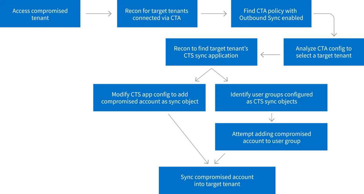 After this, the threat actor can discover the CTS host sync application and use it to push the user account to that tenant which grants access to the target tenant.
