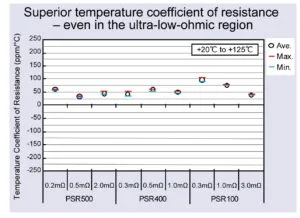 Generally, the lower the resistance the higher the temperature coefficient of resistance (TCR). However, the PSR series utilizes a high performance metallic resistive element that ensures superior TCR, even in the ultra-low-resistance region. This latest lineup is offered in resistances as low as 0.3mΩ, providing greater applicability.