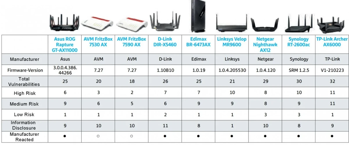 Here among other brands, the list is headed by the TP-Link Archer AX6000 with 32 security flaws, and behind TP-Link comes the Synology RT-2600ac with 30 security flaws.