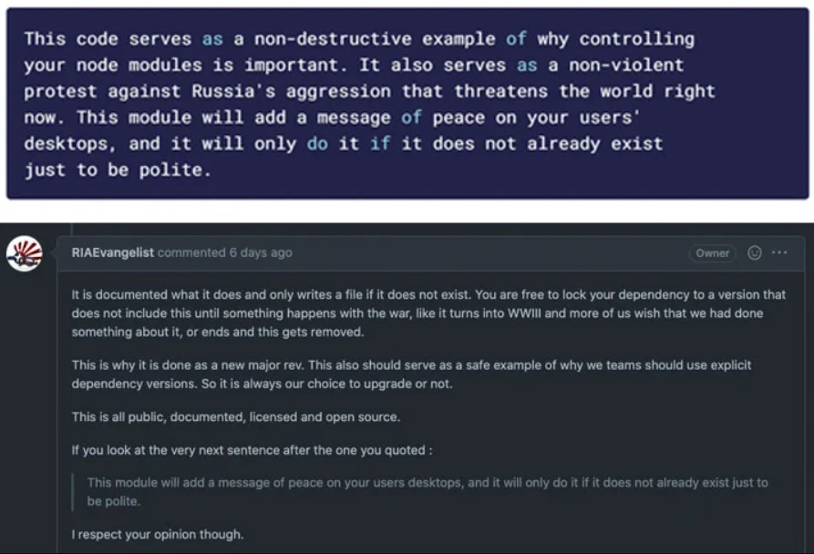 While in response, some criticized the ‘node-ipc’ developer for deleting and editing previous comments on the thread to attempt to ‘cover up’ his tracks.