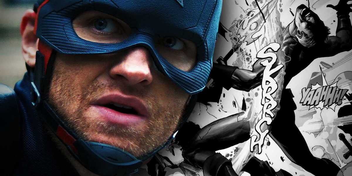 The MCU's John Walker next to the comic panels showing his arm and leg being removed by Nuke