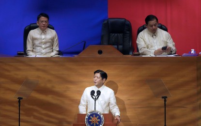 NATION LISTENS. President Ferdinand R. Marcos Jr. delivers his third State of the Nation Address at Batasang Pambansa in Quezon City on Monday (July 22, 2024), with Senate President Francis Escudero (left) and House of Representatives Speaker Martin Romualdez. Marcos has endorsed “experiential tourism” as the country seeks more ways to attract foreign and local visitors to travel around the Philippines. (PNA photo by Joan Bondoc)