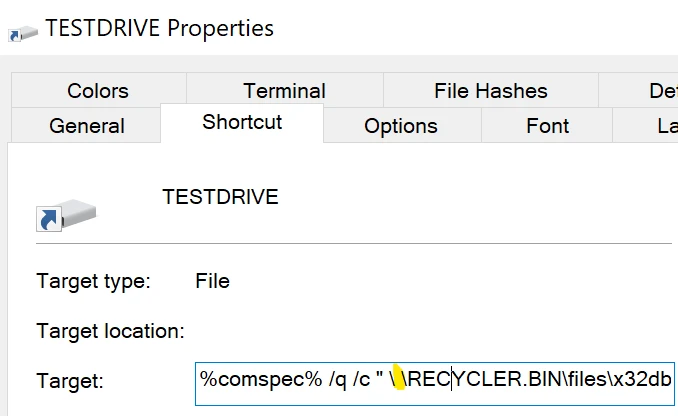 Linux systems have these directories visible while Windows systems do not have them visible. A Windows shortcut (.lnk) file is created on the root folder of the USB device, in order to execute the malware code from the concealed directory.