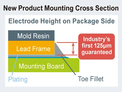 Extremely high solder mounting reliability is achieved during AOI in automotive systems that require high quality. In addition, the new bottom electrode package simultaneously provides both breakthrough miniaturization and high heat dissipation (which are normally in a trade-off relationship), making it ideal for ADAS and automotive ECUs featuring higher board densities.