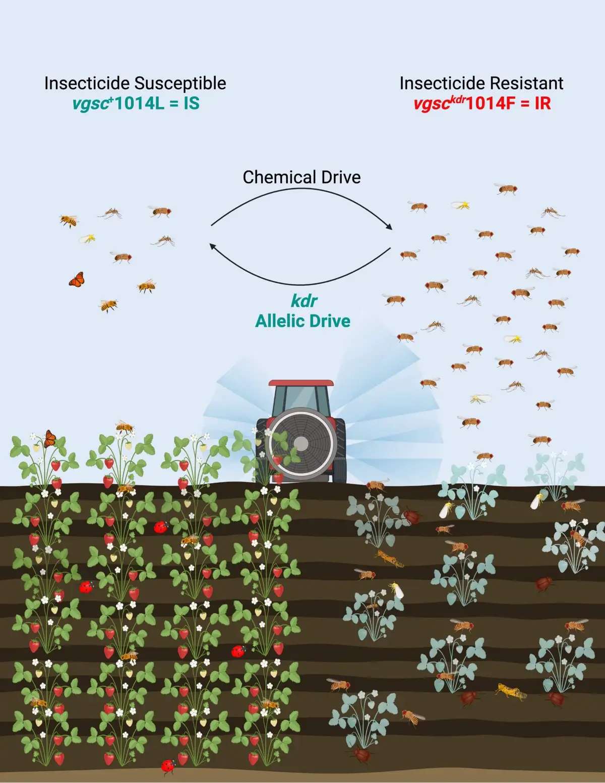 “An exciting possibility is to use allelic drives to introduce novel versions of the VGSC that are even more sensitive to insecticides than wild-type VGSCs,” suggested Craig Montell (UC Santa Barbara), a co-author on this study. “This could potentially allow even lower levels of insecticides to be introduced into the environment to control pests and disease vectors.”