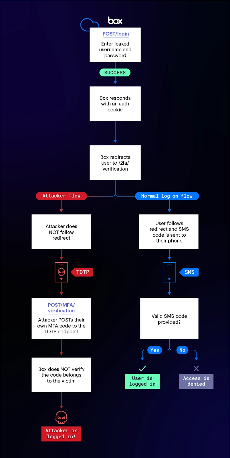 In this event, the Box allows for “MFA confusion,” which enables an attacker to bypass the SMS-based multi-factor authentication.