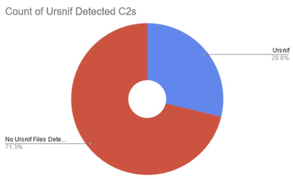 After analysis, it was found that approximately 30% of the infrastructure revealed communication with files detected as Ursnif, with an average detection rate of only 4.78 in Virus Total among the identified Ursnif C2s; moreover, around 71.3% of the IP addresses showed no communication with any files.