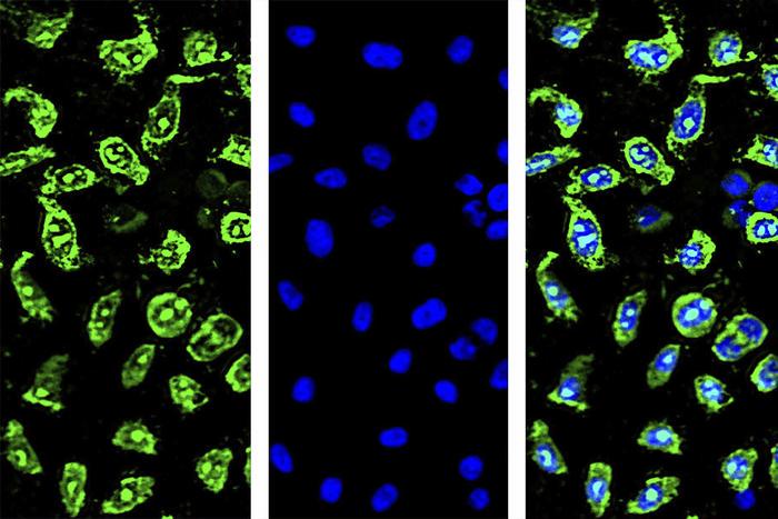 A microdialysis-captured peptide can enter the cells.The cells have been cultured in a dish, and the peptide found in the microdialysis screening (green marker) has been added to the culture medium. The peptide (stained blue) can attach to cells and efficiently enter the cells. In the body, this peptide can penetrate tissues using the ‘transport routes’ inside cells.