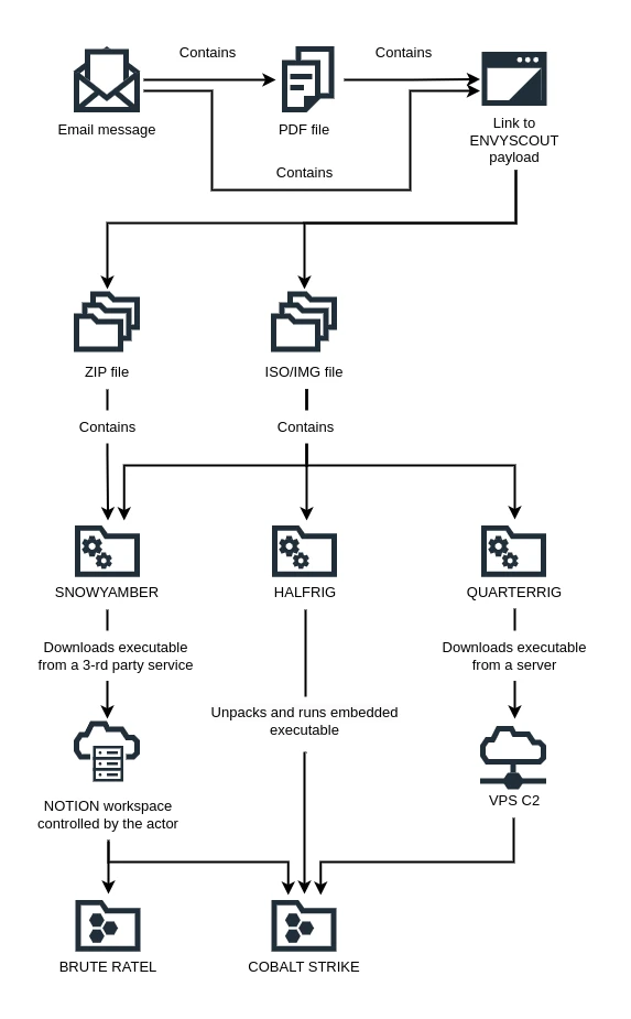 The EnvyScout dropper, facilitated by HTML smuggling on APT29-controlled websites, infected victims, leading to the deployment of malware downloaders like:-
