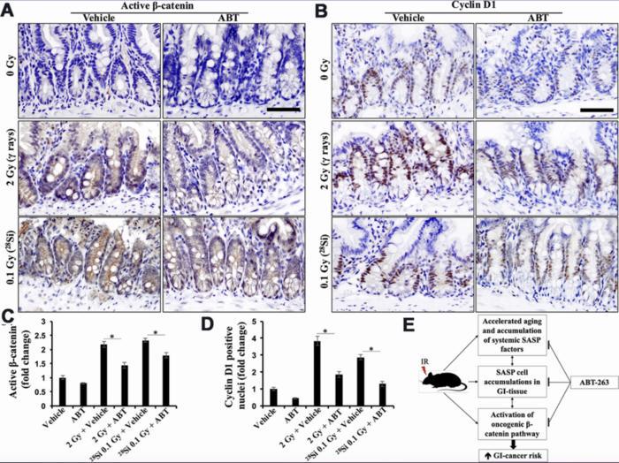 Keywords: aging, senolytic agent, gastrointestinal cancer, radiation exposure, senescence, inflammation, β-catenin