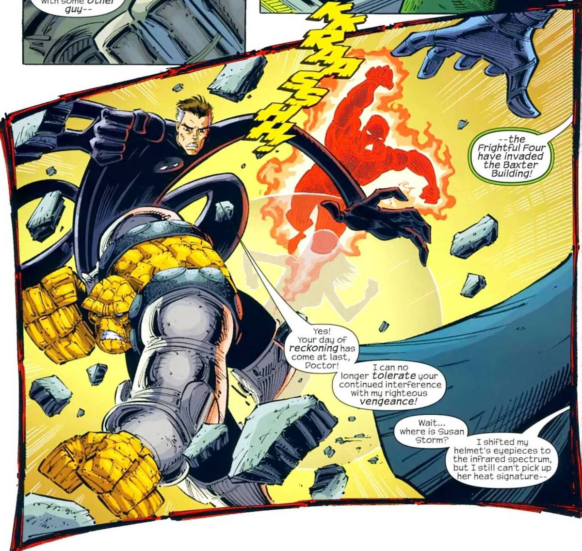 The Frightful Four also have more to offer than a name change. Their usual blue uniforms have been traded for a sleek black look, seen on both Reed Richards and Ben Grimm. Mr. Devious is, of course, still a genius, and the team of baddies benefits from his inventions just like the Fantastic Four. Sue is able to hide her heat signature with specialized thermal lining and Monsterman has an incredibly designed "exo-skeleton" to combat Doc Iron's gravity projector. The Human Pyre doesn't get any specific upgrades mentioned, but that's likely only because Johnny's stay in the timeline was incredibly brief.