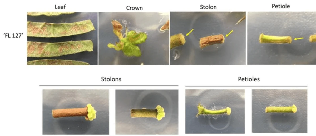 The recent cultivar Sweet Sensation® ‘Florida127’ and advanced selection ‘Florida Brilliance’ (FL 13.26-134) were used for tissue culture optimization. As shown in Figure 1, callus induction was tested with different strawberry tissues, and embryogenic callus growth was most vigorous on stolons (runners) and petioles. To identify the optimal conditions for shoot and root regeneration for Sweet Sensation® ‘Florida127’ and ‘Florida Brilliance’ (FL 13.26-134), explants were grown on a range of media with varying compositions of plant growth regulators.