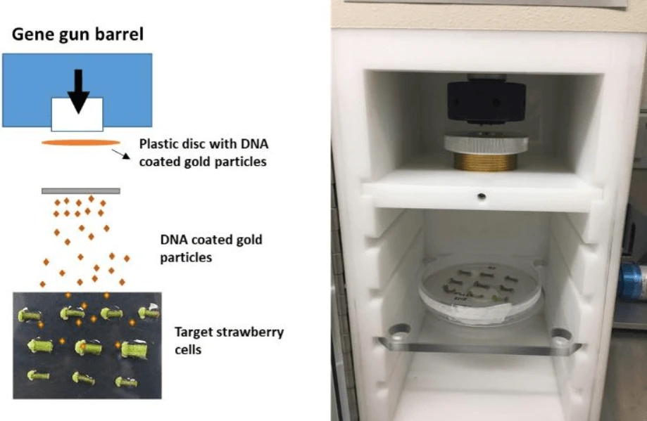 Once the genetically engineered gene product is ready for CRISPR gene editing, transformation, where the new genetic material is delivered to a single strawberry cell, is the first step in the genetic engineering process. For DNA delivery, two major transformation methods, such as Agrobacterium tumefaciens‐mediated or biolistic (gene gun)‐mediated transformation, are widely used for CRISPR gene editing. Agrobacterium tumefaciens is a widespread, naturally occurring soil bacterium that causes crown gall in many plant species and has the ability to introduce new genetic material into plant cells (Gelvin 2003). This bacterium works as a natural genetic engineer and is used in labs for plant transformation. Gene-edited plants using Agrobacterium-mediated transformation will contain foreign bacterial DNA sequences. It is not an easy process to remove the bacterium-derived DNA sequences through breeding.